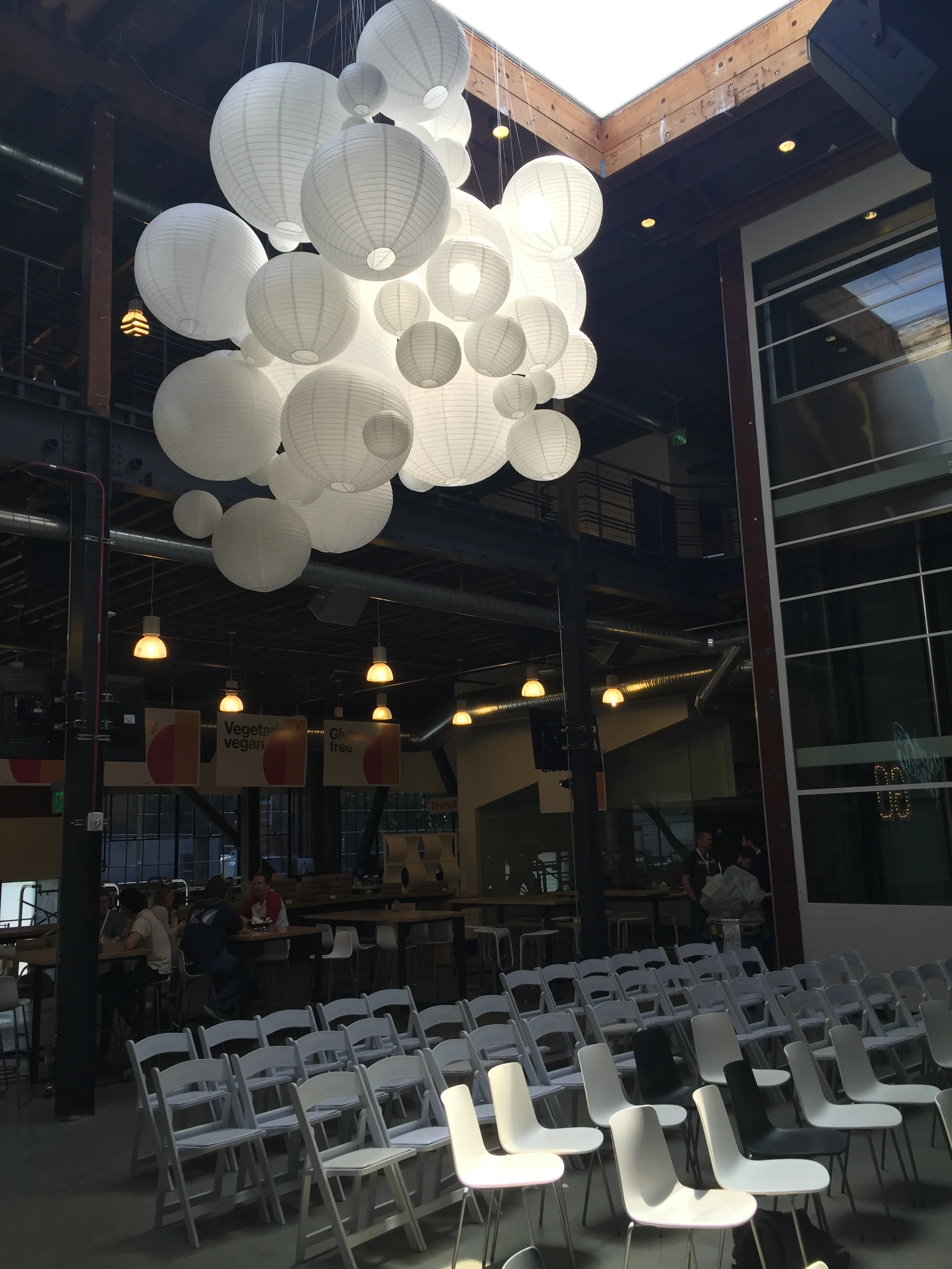 Budgets were generally tight for office installations, but it led to some delightfully scrappy solutions like the lantern sculpture below (which I physically made with fishing line and a scissor lift and a few friends for only $250). Pinterest CEO Ben Silbermann commented the following on an Instagram shot of it: "I love it. One of my favorite parts of our office!"