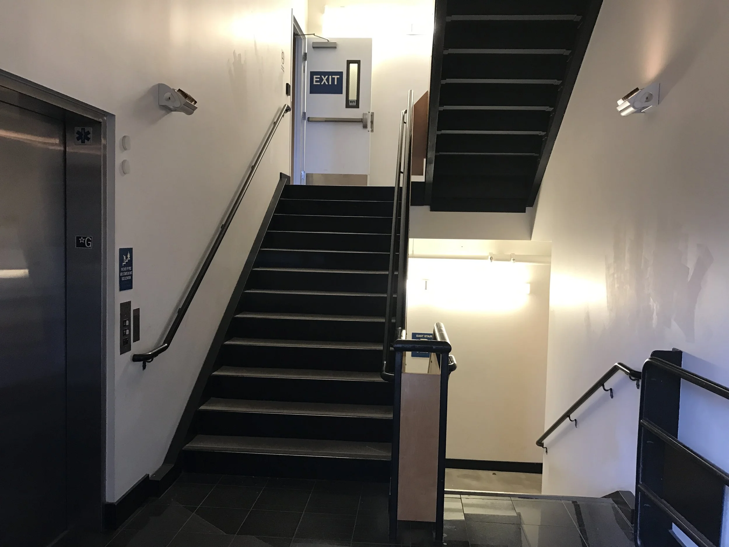 Through a miscommunication with the finance team, we believed we had zero dollars budget for the branding of this unfortunate entryway into a new engineering overflow building. I got creative with paint (already budgeted for) and created this simple solution that helped lead up the stair to the reception desk.